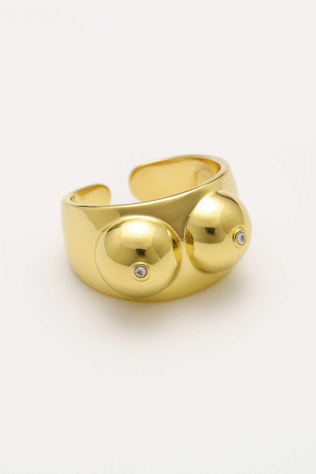 A bold sculptural ring celebrating body positivity and feminine strength. Crafted in smooth polished metal with a wide adjustable band, it features two domed forms accented by subtle cubic zirconia...