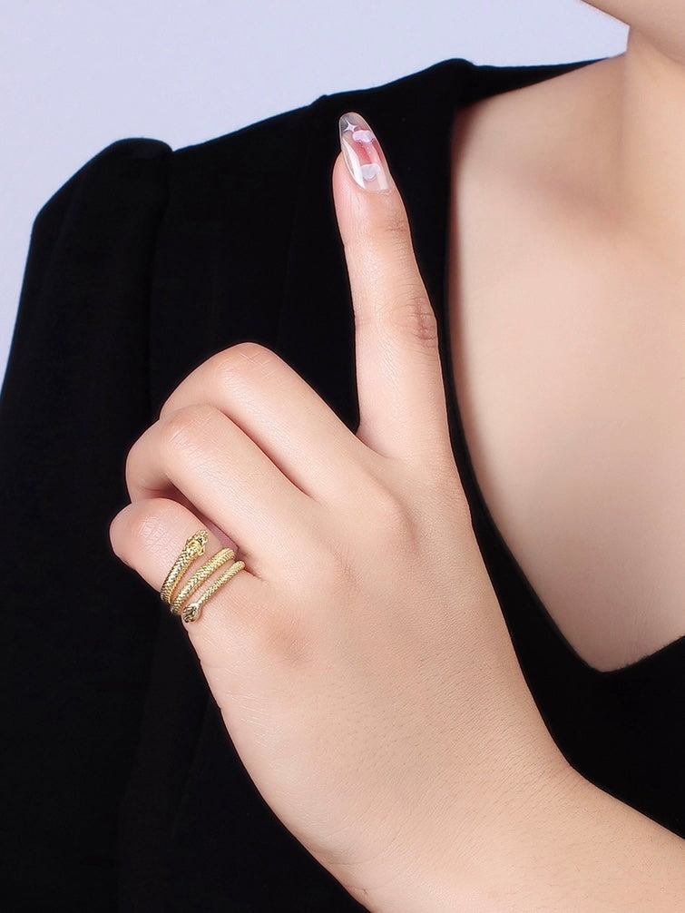 A bold triple-wrap gold ring designed with detailed dragon-scale texture and a serpent head motif. Striking, unique, and easy to adjust for the perfect fit. • Brass, 14K Gold Filled...