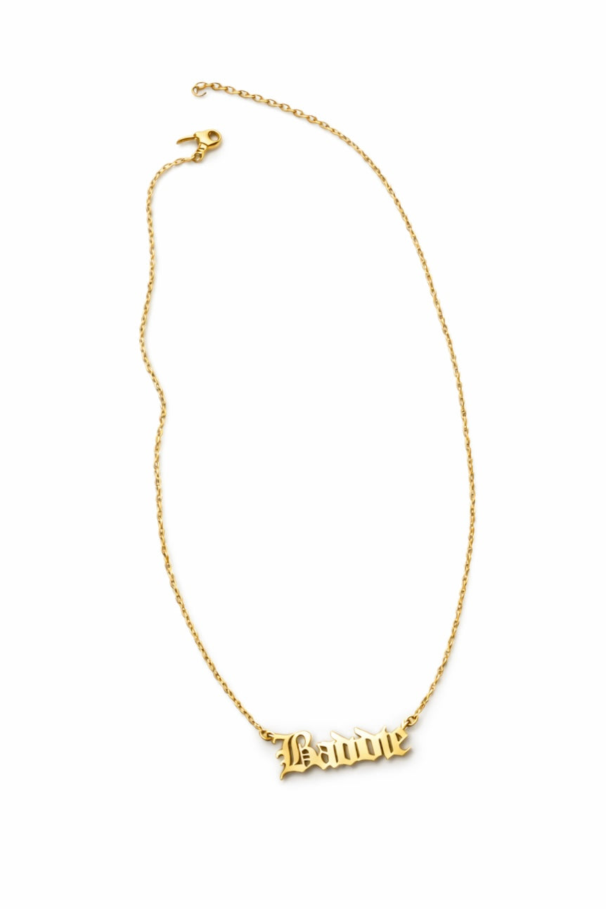 A Baddie nameplate necklace with bold lettering and adjustable length. • Stainless Steel• Nickel and Lead Free• Adjustable Chain: 18”–20”• Nameplate Width: • Imported
