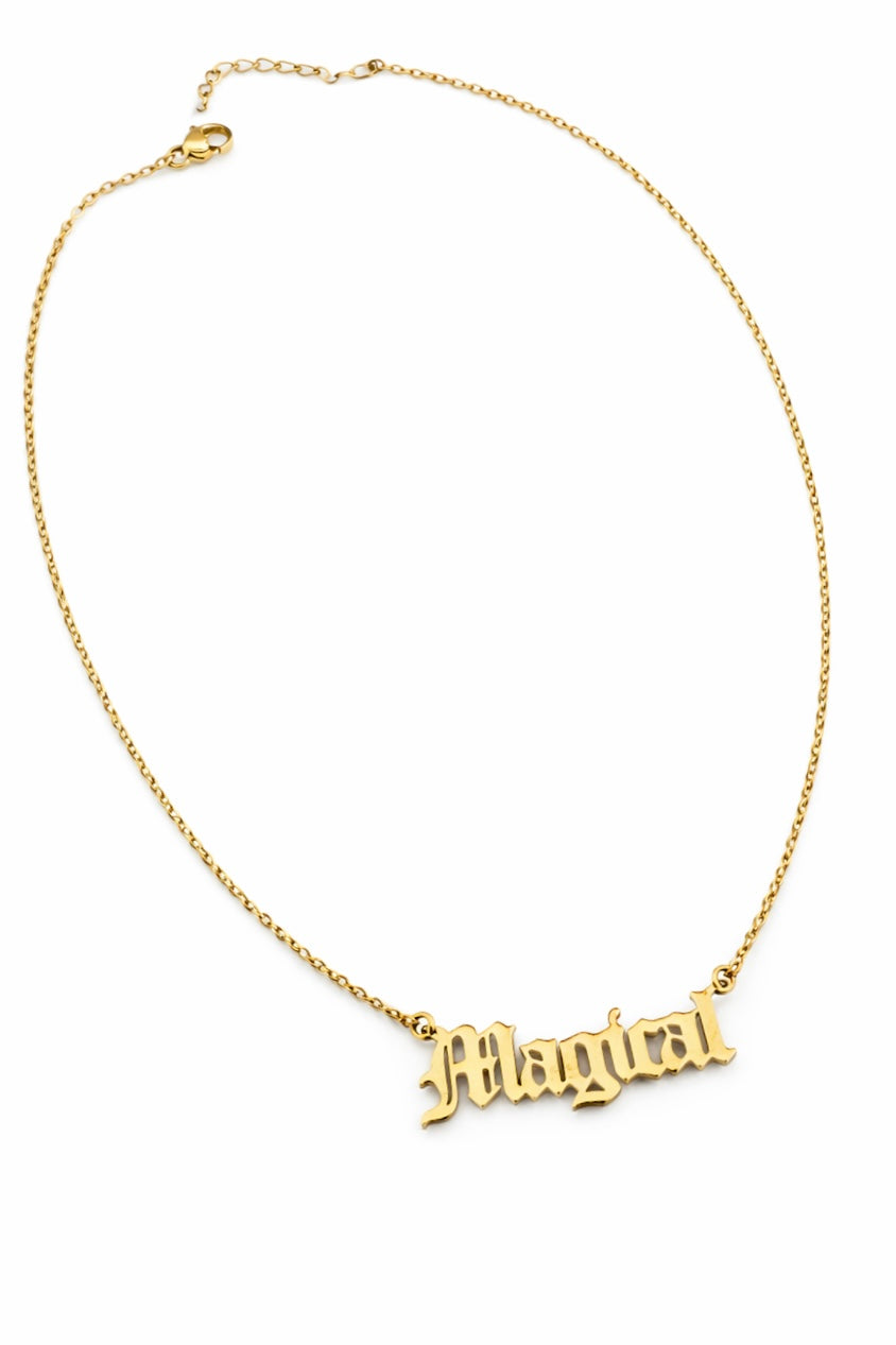 A Magical nameplate necklace with bold lettering and adjustable length. • Stainless Steel• Nickel and Lead Free• Adjustable Chain: 18”–20”• Nameplate Width: • Imported