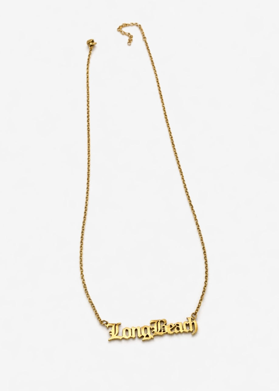 A Long Beach nameplate necklace with bold lettering and adjustable length. • Old English• Nickel and Lead Free• Adjustable Chain: 18”–20”• Nameplate Width: ___• Imported
